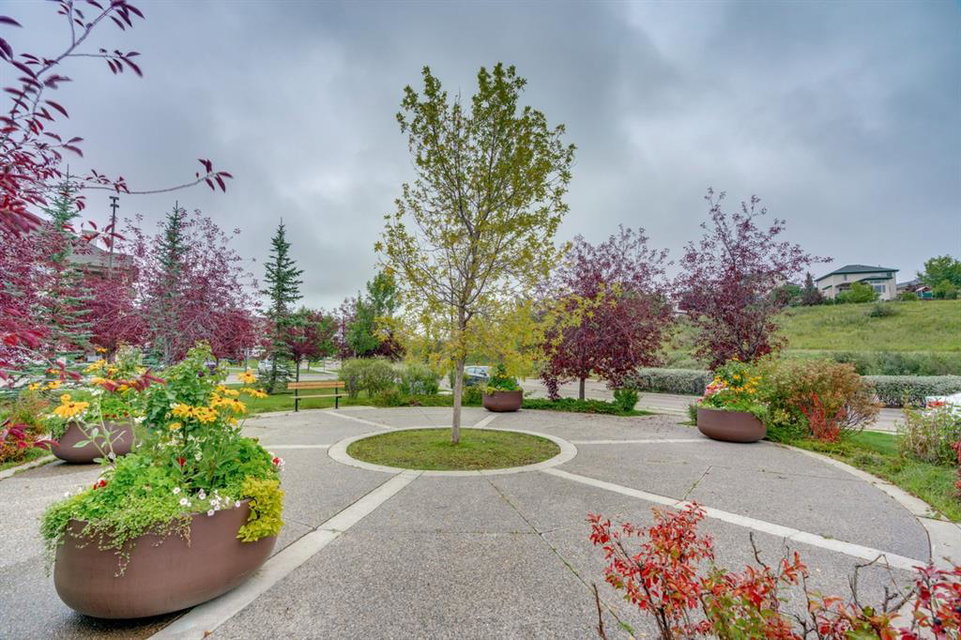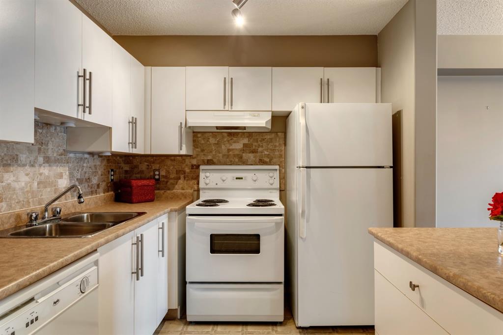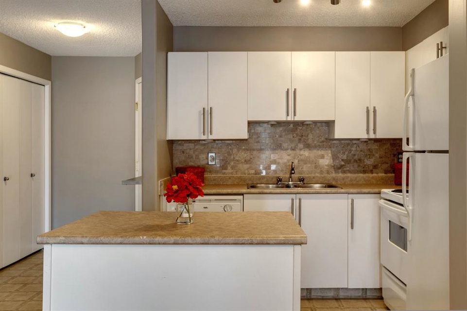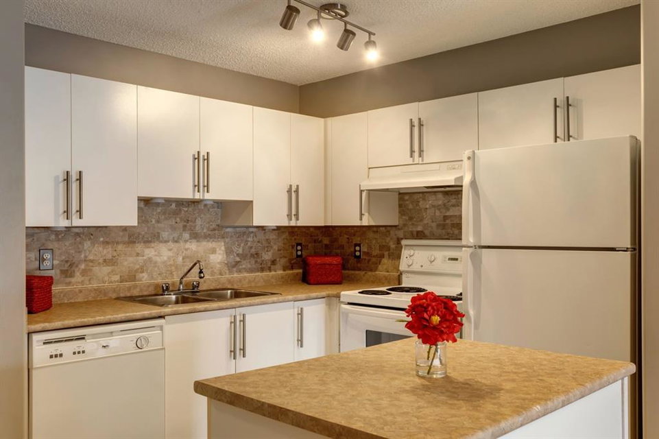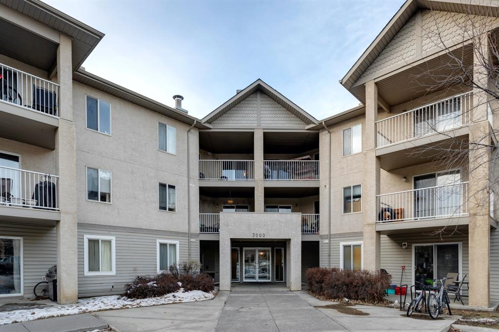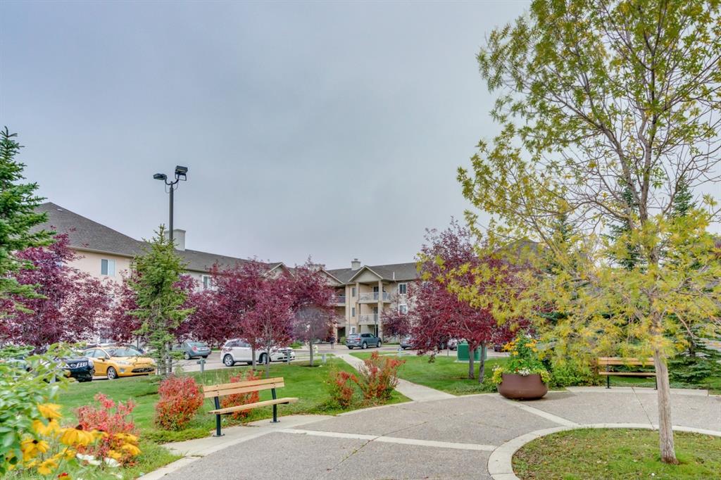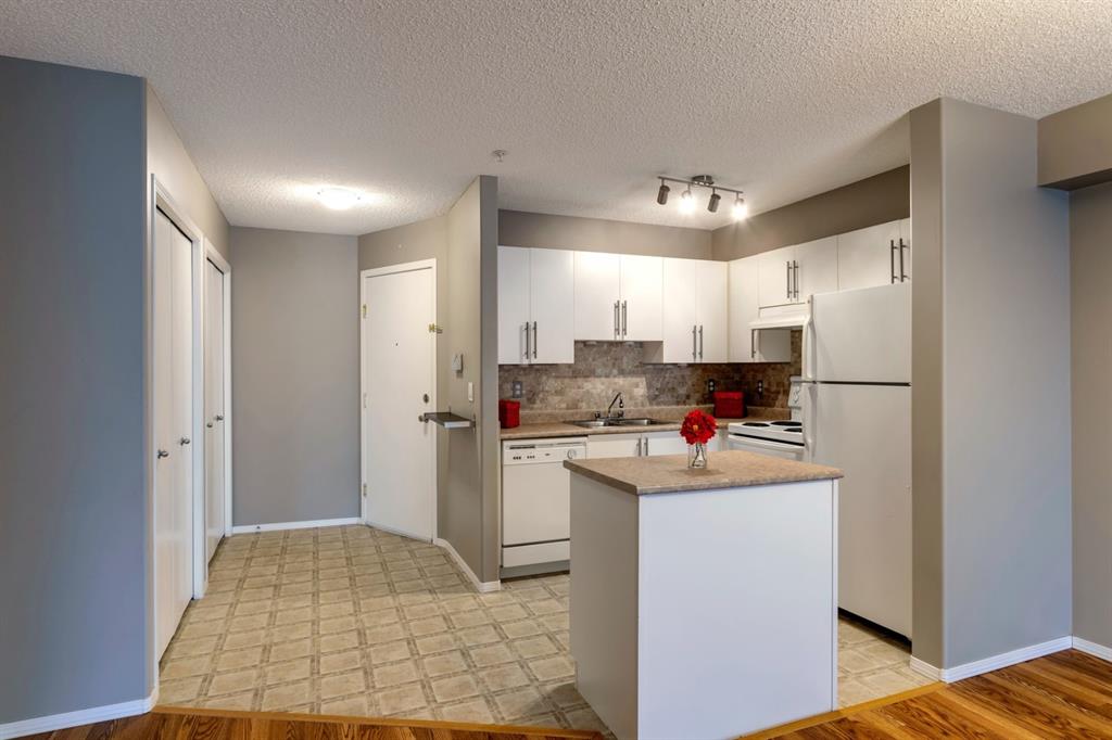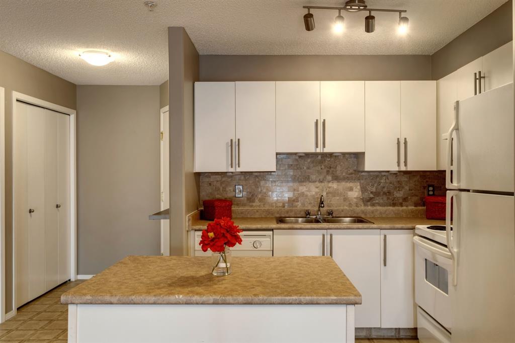 LOW CONDO FEES INCLUDE UTILITIES!WHY RENT WHEN YOU COULD OWN! LOCATED ON THE MAIN FLOOR-NO RIDING ON THE ELEVATOR! This spacious one bedroom condo is move in ready with laminate flooring and brand new carpet. You will appreciate the open concept floor plan which accommodates numerous ways to arrange your furniture and the perfect area for entertaining. Gaze out your lovely patio doors (allowing plenty of natural sunlight) to your private patio which backs onto a beautiful greenspace which feels like your own back yard. The kitchen with breakfast island includes plenty of cupboard space (use the additional storage in the island for your extra kitchen gadgets). The huge master includes TWO closets in addition to the two closets in the foyer. Plenty of storage in your insuite laundry room and the location of this unit (the largest 1 bedroom floor plan) is ideal for anyone with mobility issues. An excellent location steps away from walk paths, park with easy access to schools, Crowfoot Mall, Beacon Hill, YMCA, library, restaurants, LRT, bus route & major traffic routes.