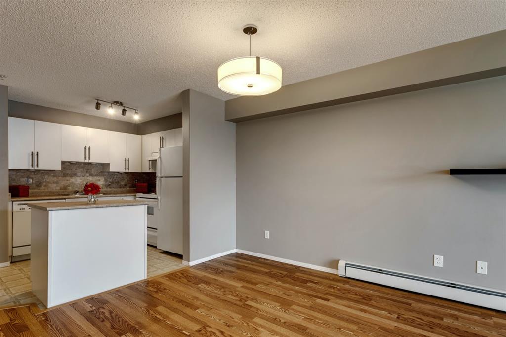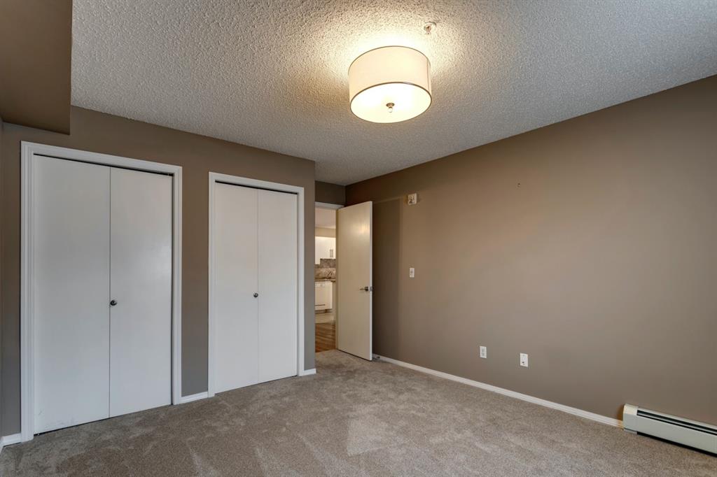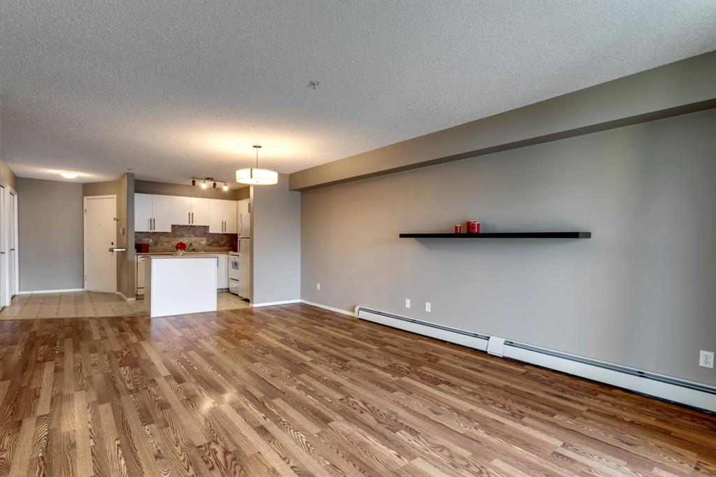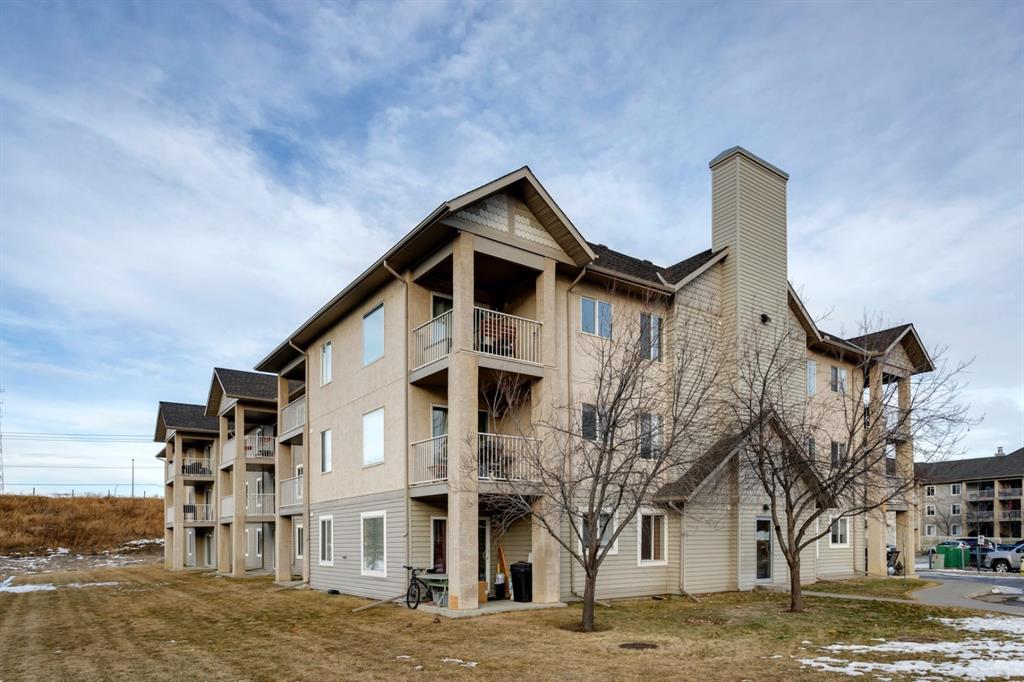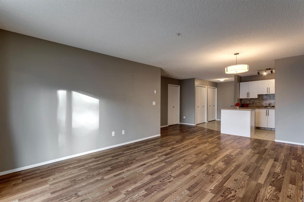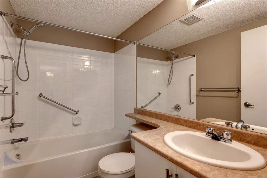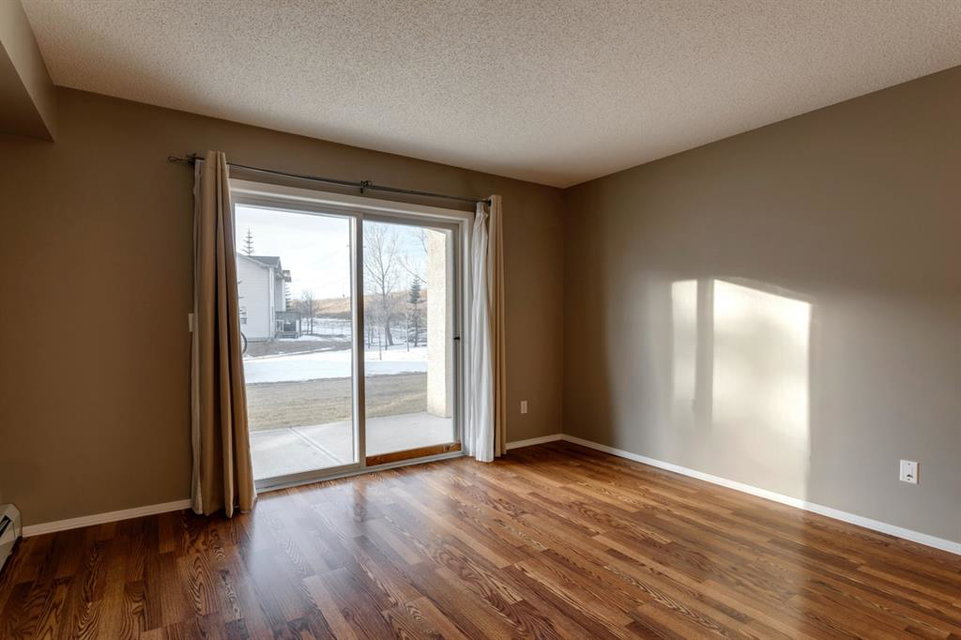 LOW CONDO FEES INCLUDE UTILITIES!WHY RENT WHEN YOU COULD OWN! LOCATED ON THE MAIN FLOOR-NO RIDING ON THE ELEVATOR! This spacious one bedroom condo is move in ready with laminate flooring and brand new carpet. You will appreciate the open concept floor plan which accommodates numerous ways to arrange your furniture and the perfect area for entertaining. Gaze out your lovely patio doors (allowing plenty of natural sunlight) to your private patio which backs onto a beautiful greenspace which feels like your own back yard. The kitchen with breakfast island includes plenty of cupboard space (use the additional storage in the island for your extra kitchen gadgets). The huge master includes TWO closets in addition to the two closets in the foyer. Plenty of storage in your insuite laundry room and the location of this unit (the largest 1 bedroom floor plan) is ideal for anyone with mobility issues. An excellent location steps away from walk paths, park with easy access to schools, Crowfoot Mall, Beacon Hill, YMCA, library, restaurants, LRT, bus route & major traffic routes.