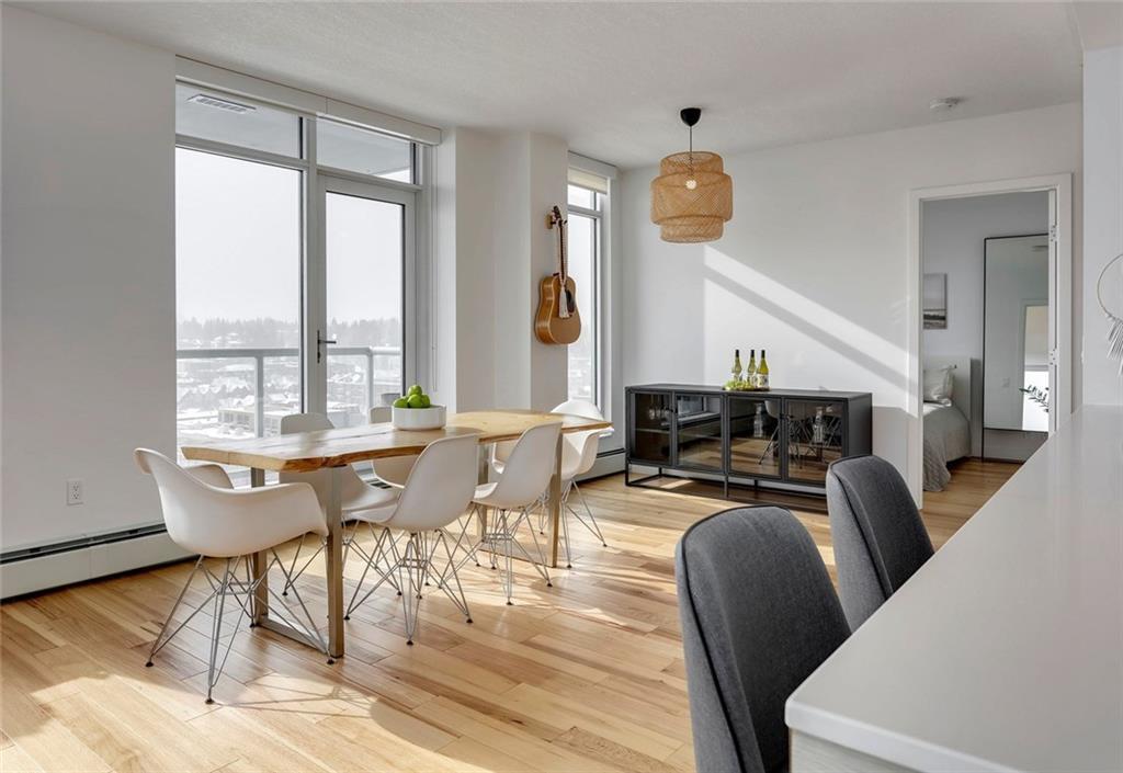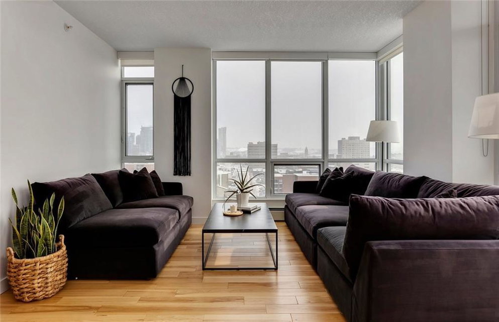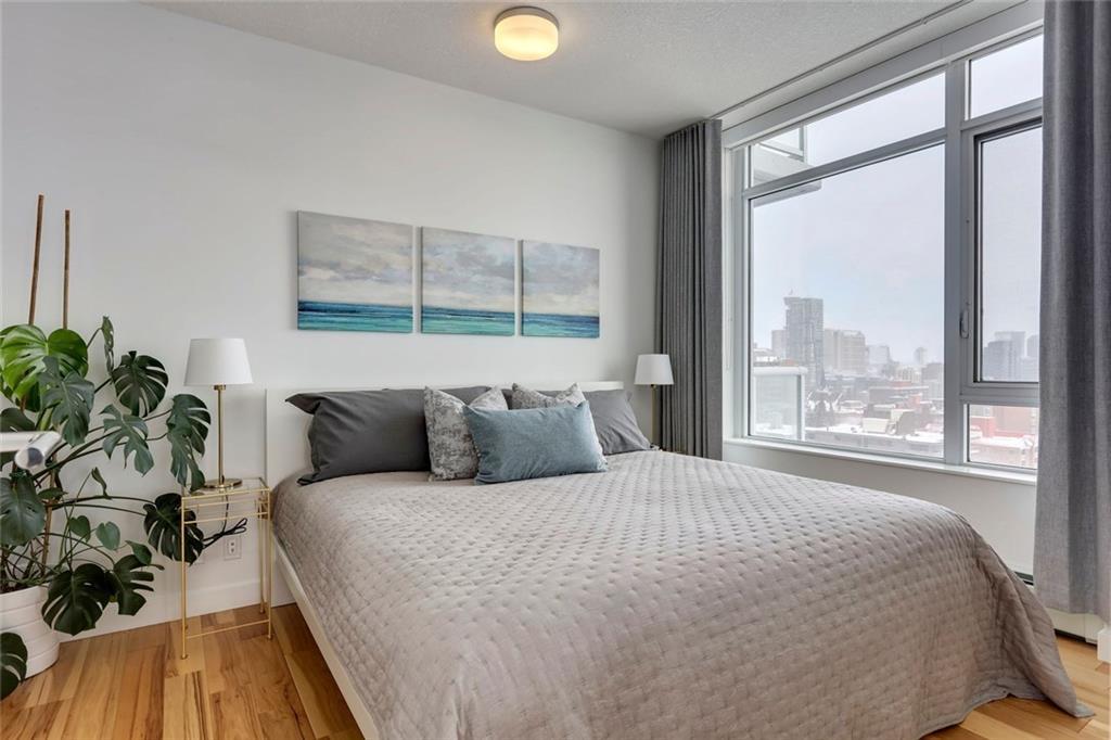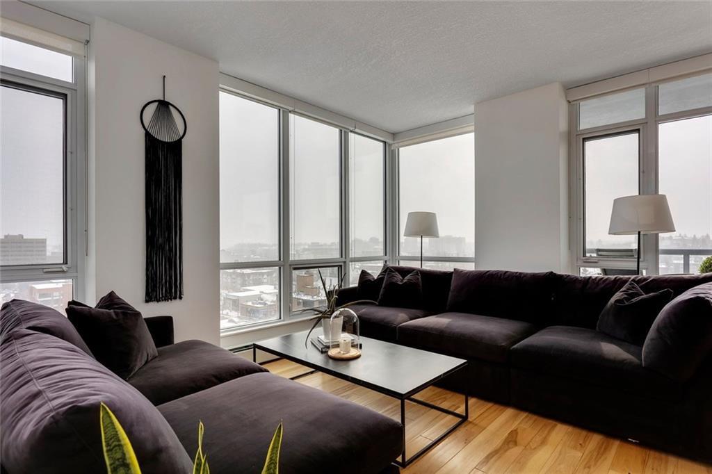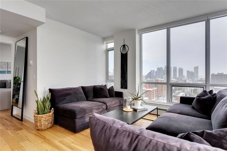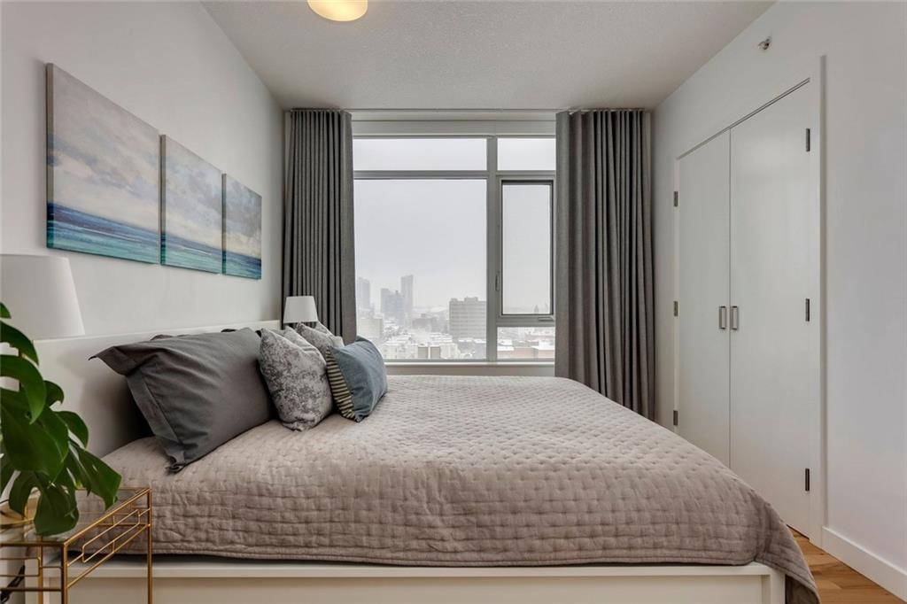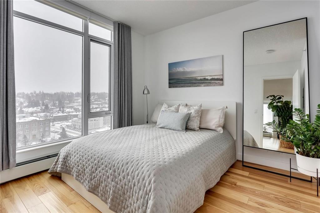 RARE FIND! A bright, modern & immaculately kept suite at SMITH is just steps to vibrant 17thAve. This quiet, sunny SE corner unit on the 12thfloor showcases sweeping views of the downtown skyline and Mount Royal with 9ft ceilings, large windows and custom window shades. EXCEPTIONAL LAYOUT! Contemporary kitchen boasts quartz counters, s/s appliances, gas range and a 10+ft island that blends into the large living and dining rooms in an open concept with custom hickory hardwood t/o. The master easily fits a king bed with a walk-in closet and spa-inspired 5pc ensuite with in-floor heat, quartz counters, walk-in shower and soaker tub. 2ndbedroom has a 4pc ensuite with in-floor heat. Watch the sunrise & sunset with a partial mountain view on the expansive private balcony. Concierge, titled storage, in-suite laundry, custom black out bedroom curtains, bike room, bike share, direct bike lane access, tool share, prime titled stall, guest parking & an owner’s lounge round out the perks in this well-run building.