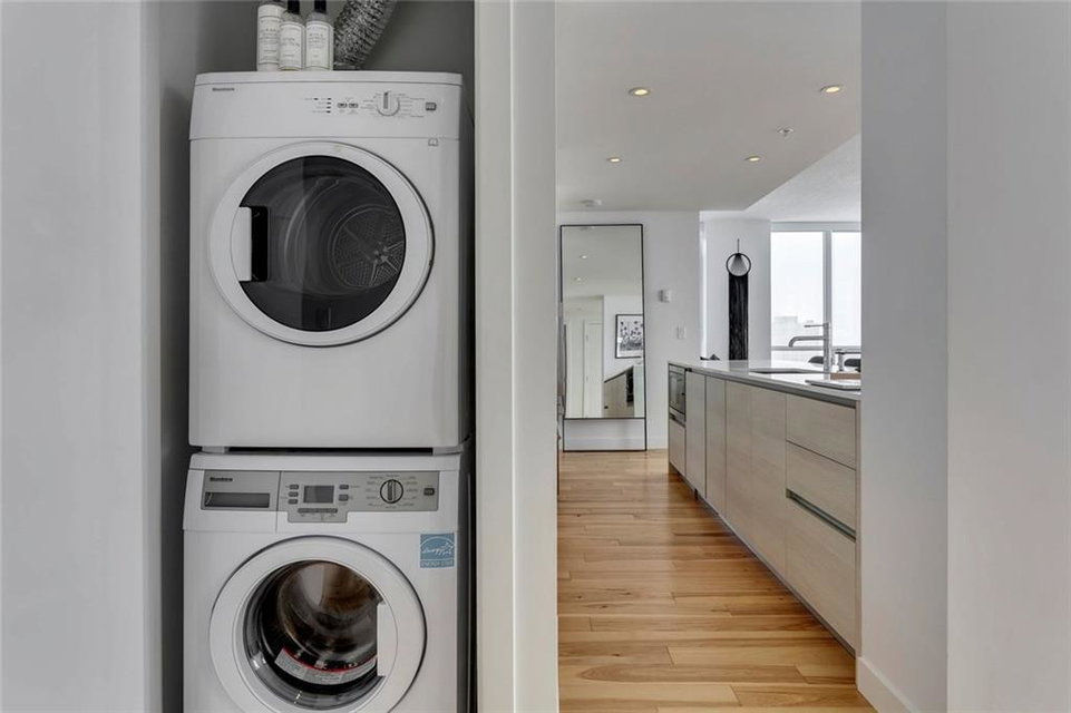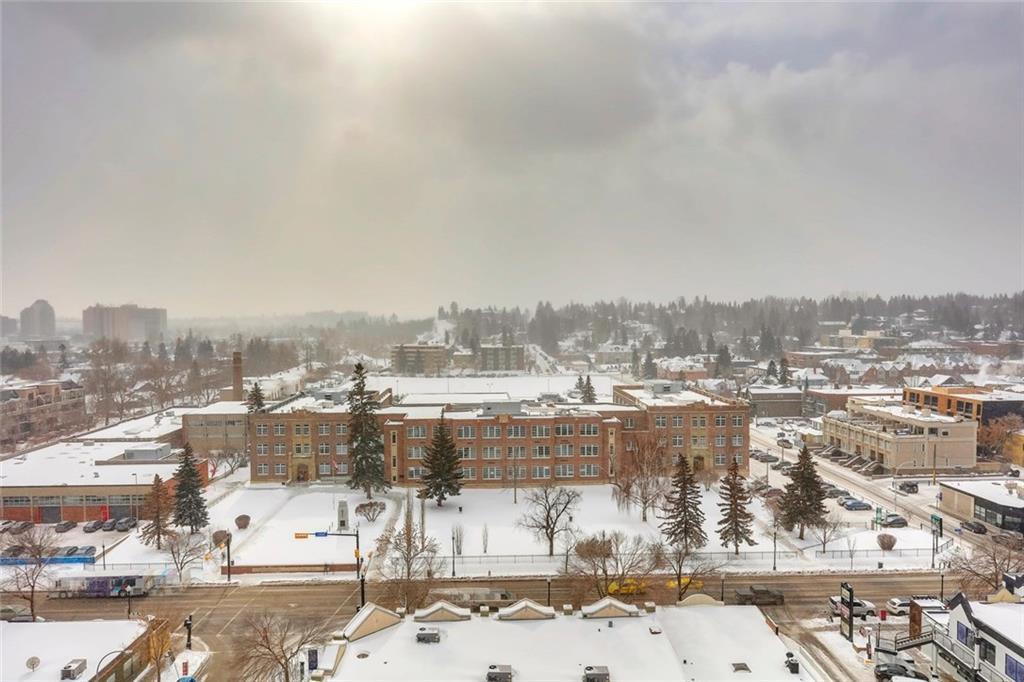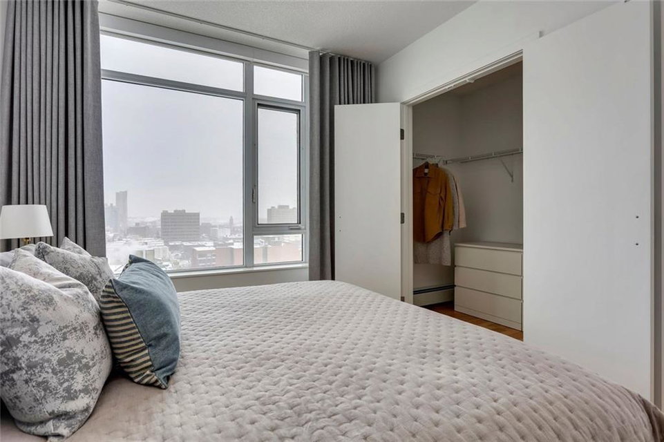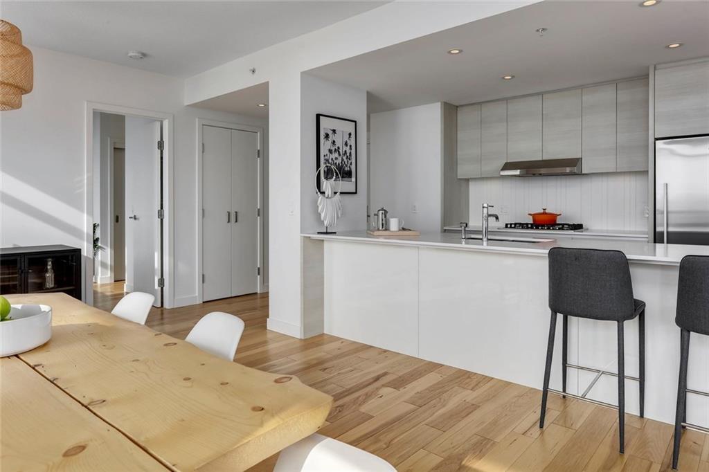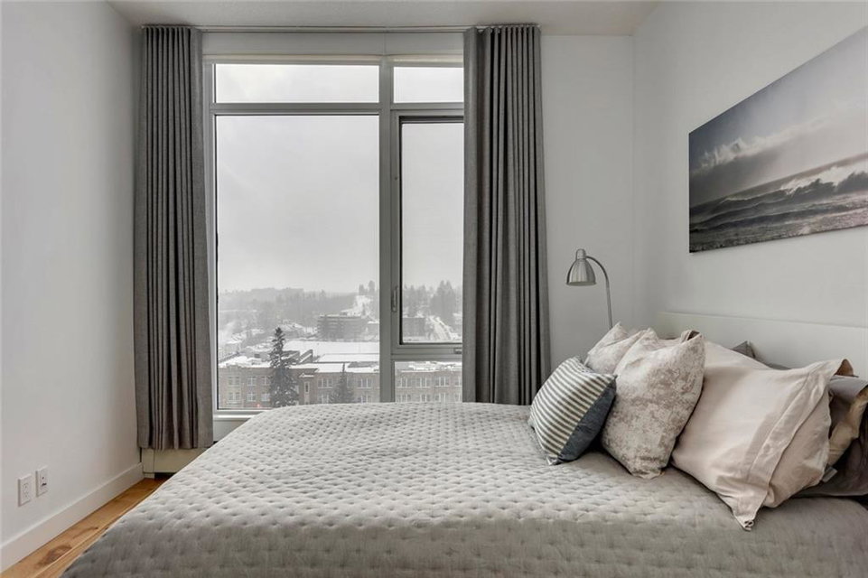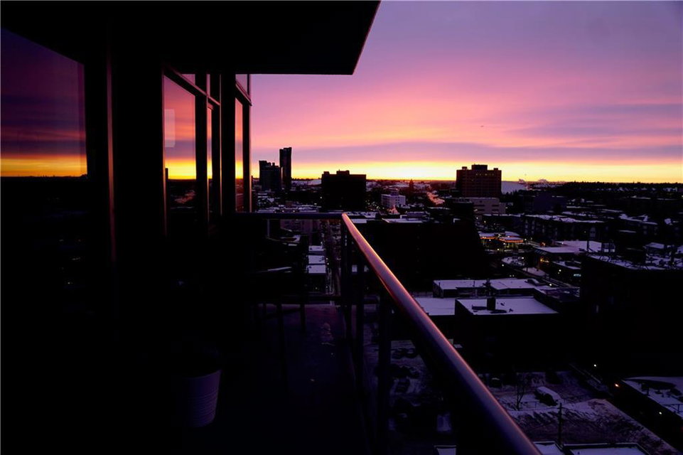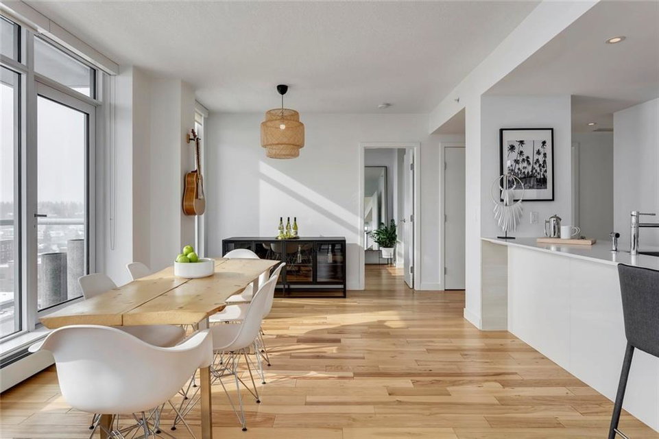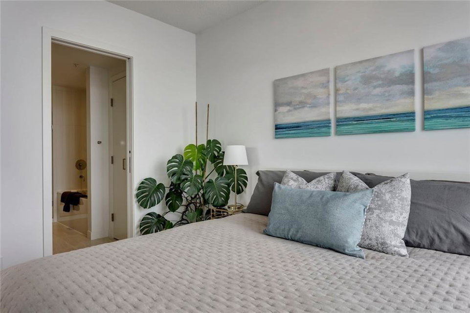 RARE FIND! A bright, modern & immaculately kept suite at SMITH is just steps to vibrant 17thAve. This quiet, sunny SE corner unit on the 12thfloor showcases sweeping views of the downtown skyline and Mount Royal with 9ft ceilings, large windows and custom window shades. EXCEPTIONAL LAYOUT! Contemporary kitchen boasts quartz counters, s/s appliances, gas range and a 10+ft island that blends into the large living and dining rooms in an open concept with custom hickory hardwood t/o. The master easily fits a king bed with a walk-in closet and spa-inspired 5pc ensuite with in-floor heat, quartz counters, walk-in shower and soaker tub. 2ndbedroom has a 4pc ensuite with in-floor heat. Watch the sunrise & sunset with a partial mountain view on the expansive private balcony. Concierge, titled storage, in-suite laundry, custom black out bedroom curtains, bike room, bike share, direct bike lane access, tool share, prime titled stall, guest parking & an owner’s lounge round out the perks in this well-run building.