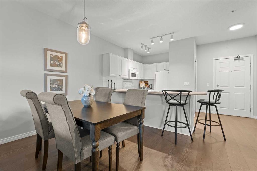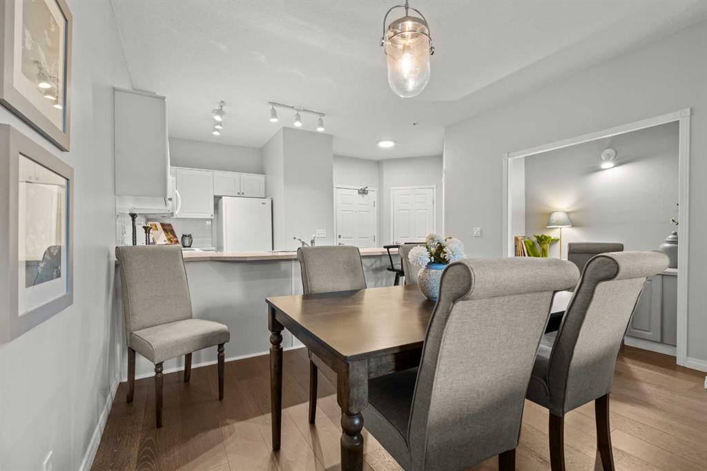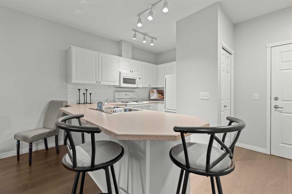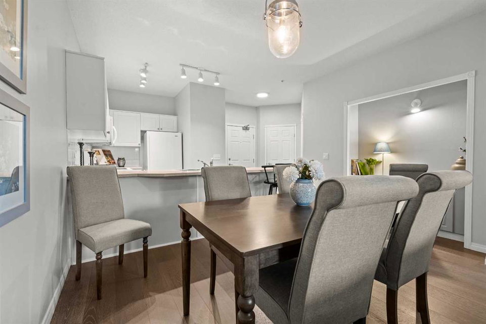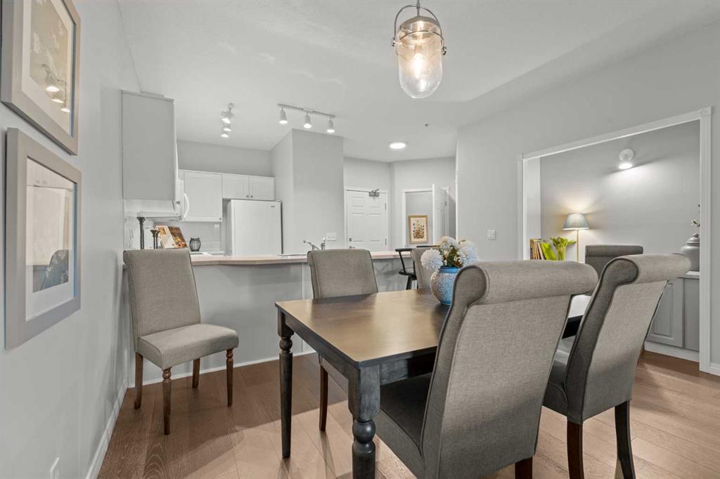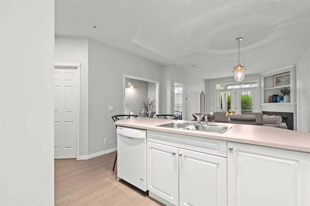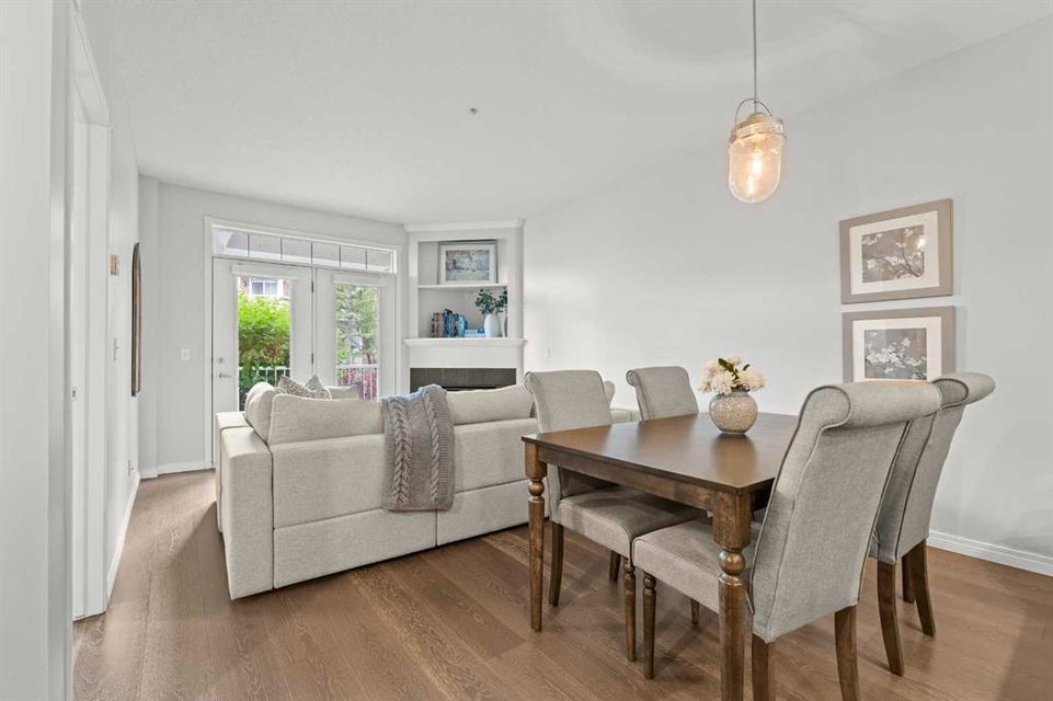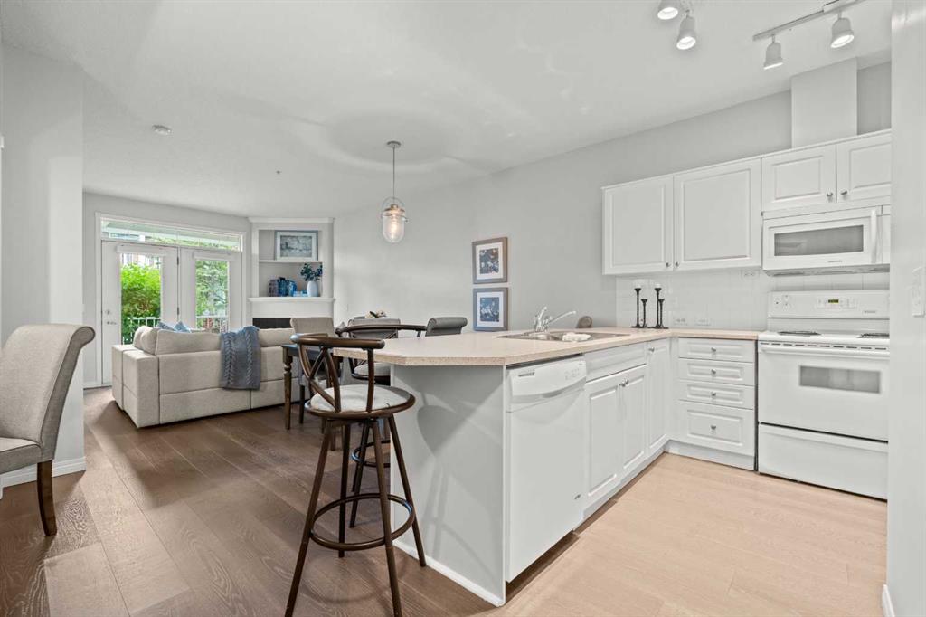 Welcome to a cozy and inviting one-bedroom main floor unit in the sought-after Courtyards of Garrison Woods! This delightful home offers a sunny east-facing balcony, perfect for morning coffee and equipped with a natural gas outlet and BBQ for your outdoor grilling needs. Step inside to find wood-like vinyl and tile flooring throughout, combined with light ceilings that create a bright and welcoming atmosphere. The kitchen is a chef’s dream, featuring a breakfast bar, ample storage, and a complete appliance package, making meal preparation a breeze. The open-concept layout includes a dining area and a living room with a charming corner fireplace, perfect for relaxing and entertaining. A built-in computer desk and storage cabinet, cleverly hidden behind bi-fold doors in the living room, provide an ideal home office space, ensuring you can work comfortably from home. The spacious bedroom offers ample closet space and direct access to a well-appointed four-piece bathroom, providing both convenience and comfort. Additional features of this fantastic unit include in-suite laundry with plenty of storage, an assigned heated underground parking stall, and an assigned storage locker. The Courtyards of Garrison Woods boasts a plethora of amenities, ensuring you can enjoy a vibrant and active lifestyle. These amenities include a party and recreation room with a kitchen, an indoor pool, fitness facilities, a car wash, bike storage, and a guest suite for your visitors. Location is everything, and this condo does not disappoint. Nestled close to the bustling Marda Loop, you’ll have easy access to parks, schools, shopping, and public transit, making your daily commute to the downtown core quick and convenient. Heat and gas are included in the condo fee, and pets are permitted with board approval, adding to the flexibility and convenience of your new home. Don’t miss the opportunity to call this comfortable and well-appointed condo in the Courtyards of Garrison Woods your new home. Schedule a viewing today and experience the perfect blend of comfort, convenience, and community!