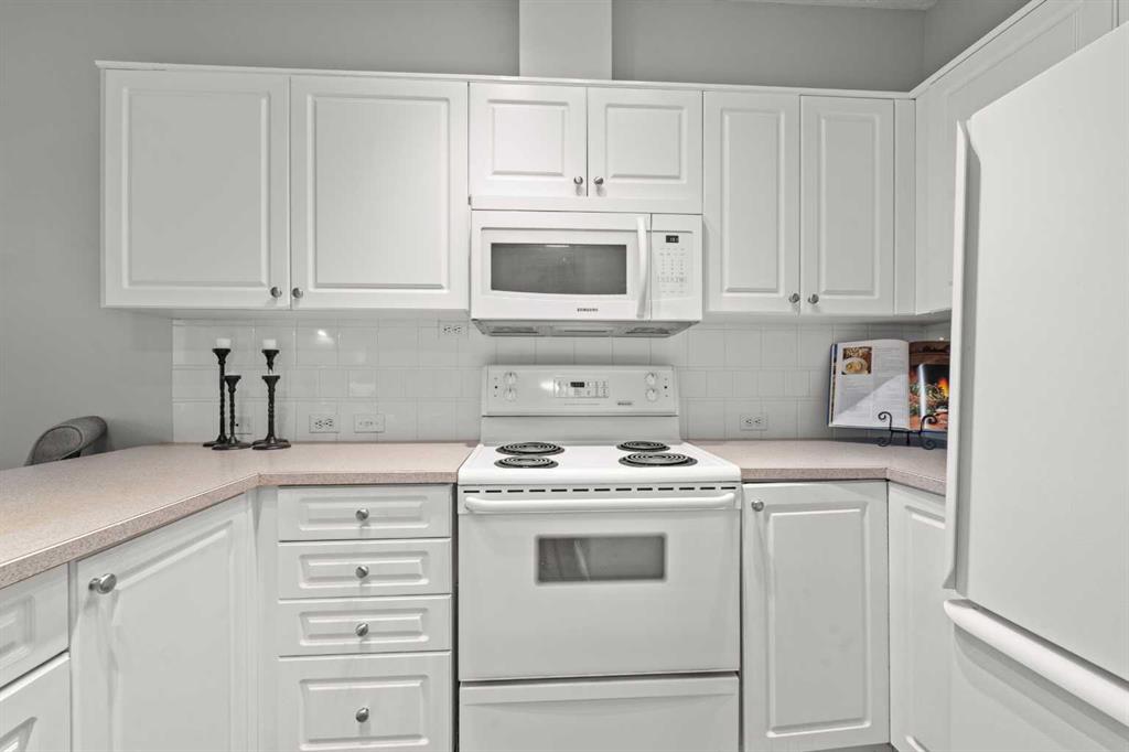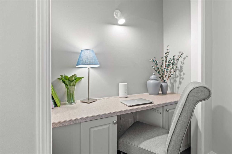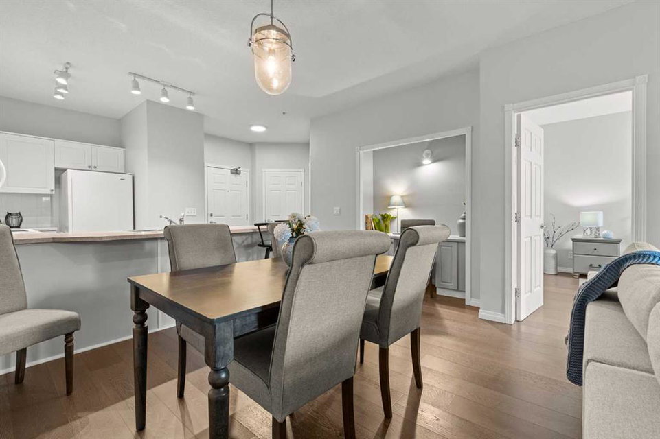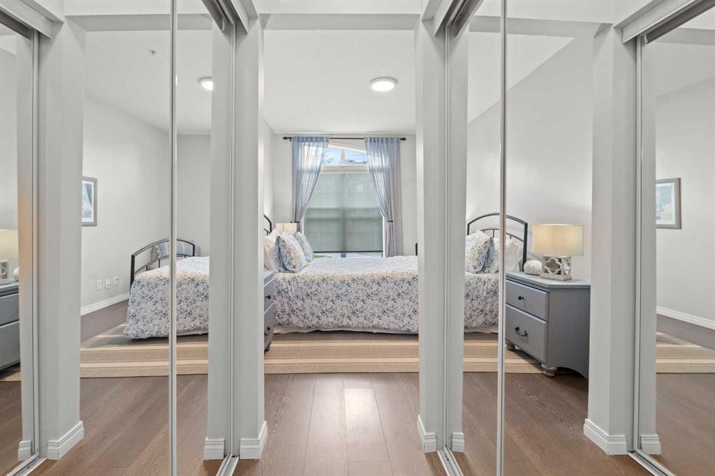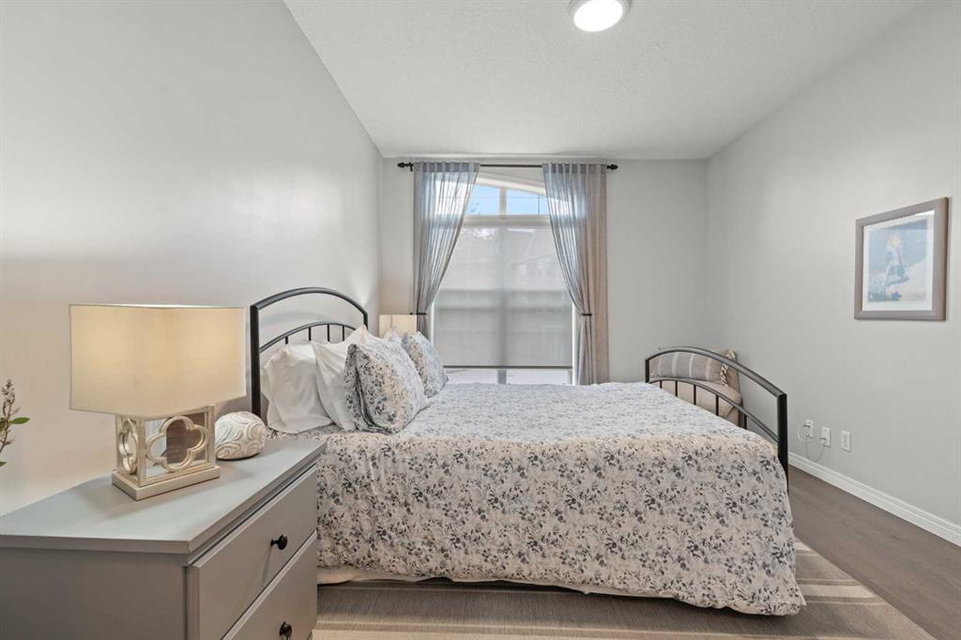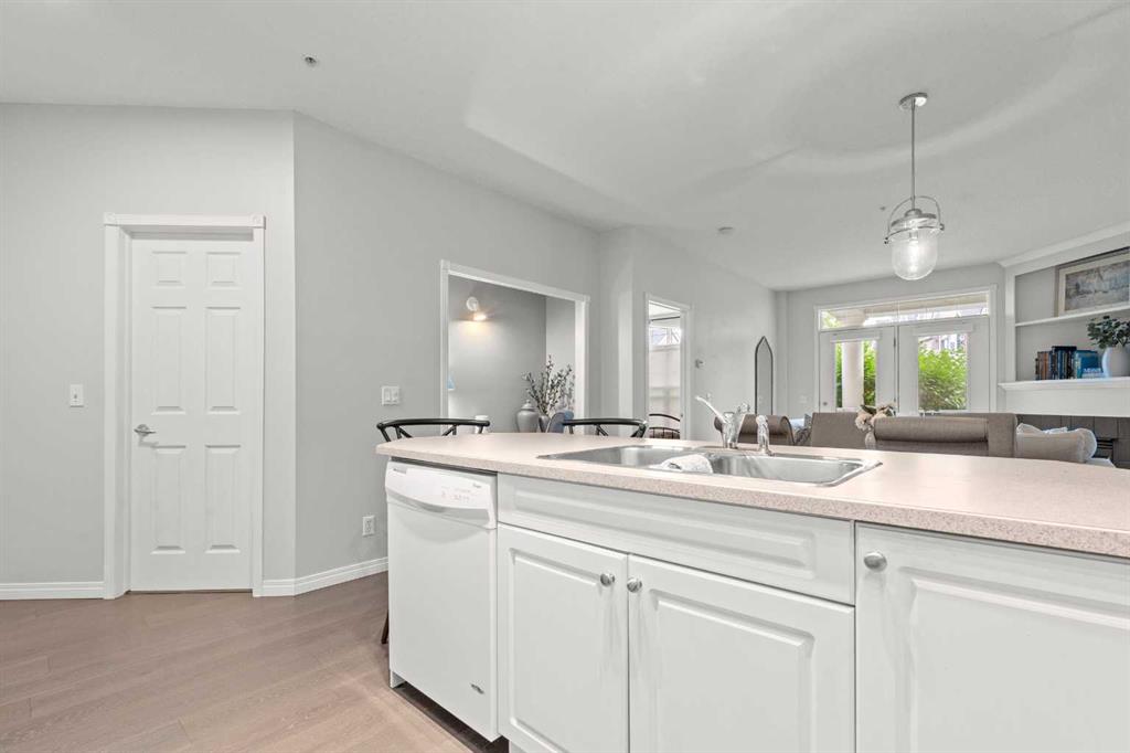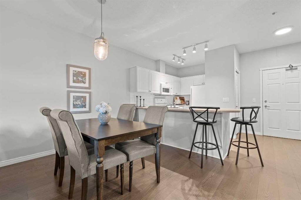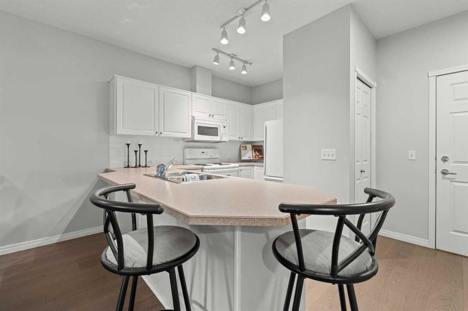 Welcome to a cozy and inviting one-bedroom main floor unit in the sought-after Courtyards of Garrison Woods! This delightful home offers a sunny east-facing balcony, perfect for morning coffee and equipped with a natural gas outlet and BBQ for your outdoor grilling needs. Step inside to find wood-like vinyl and tile flooring throughout, combined with light ceilings that create a bright and welcoming atmosphere. The kitchen is a chef’s dream, featuring a breakfast bar, ample storage, and a complete appliance package, making meal preparation a breeze. The open-concept layout includes a dining area and a living room with a charming corner fireplace, perfect for relaxing and entertaining. A built-in computer desk and storage cabinet, cleverly hidden behind bi-fold doors in the living room, provide an ideal home office space, ensuring you can work comfortably from home. The spacious bedroom offers ample closet space and direct access to a well-appointed four-piece bathroom, providing both convenience and comfort. Additional features of this fantastic unit include in-suite laundry with plenty of storage, an assigned heated underground parking stall, and an assigned storage locker. The Courtyards of Garrison Woods boasts a plethora of amenities, ensuring you can enjoy a vibrant and active lifestyle. These amenities include a party and recreation room with a kitchen, an indoor pool, fitness facilities, a car wash, bike storage, and a guest suite for your visitors. Location is everything, and this condo does not disappoint. Nestled close to the bustling Marda Loop, you’ll have easy access to parks, schools, shopping, and public transit, making your daily commute to the downtown core quick and convenient. Heat and gas are included in the condo fee, and pets are permitted with board approval, adding to the flexibility and convenience of your new home. Don’t miss the opportunity to call this comfortable and well-appointed condo in the Courtyards of Garrison Woods your new home. Schedule a viewing today and experience the perfect blend of comfort, convenience, and community!
