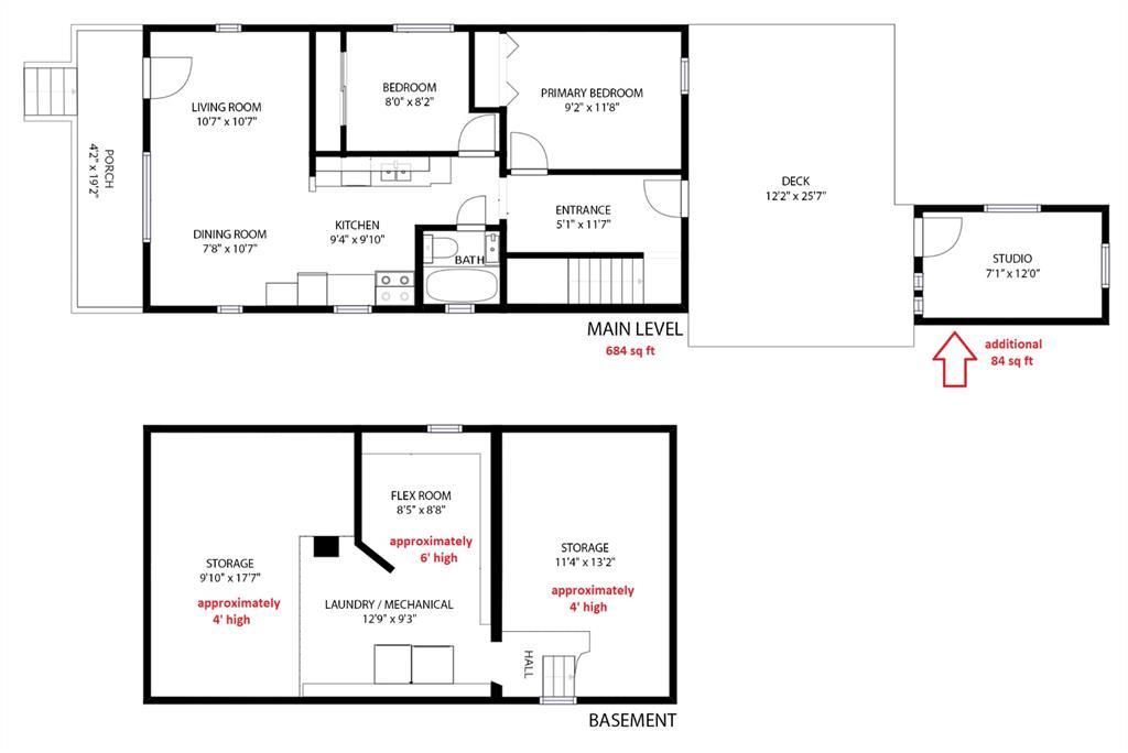 4. Open floor plan! This bungalow has SO MUCH to offer! The main floor includes: a galley style kitchen with newer appliances, low maintenance flooring, a spacious bright living room, a functional dining room with extra storage, two bedrooms (the primary bedroom can accommodate a KING-SIZED BED) and an updated 4 piece bathroom. 5. Upgrades upgrades upgrades! Recent improvements to this home include: new attic insulation, new lights, doors, flooring, new back entry, and the beautiful outdoor studio. The basement ceiling height is approximately 6’ tall in the office/laundry area. The storage areas are about 4′ high, great for boxes, tires, all the extras!