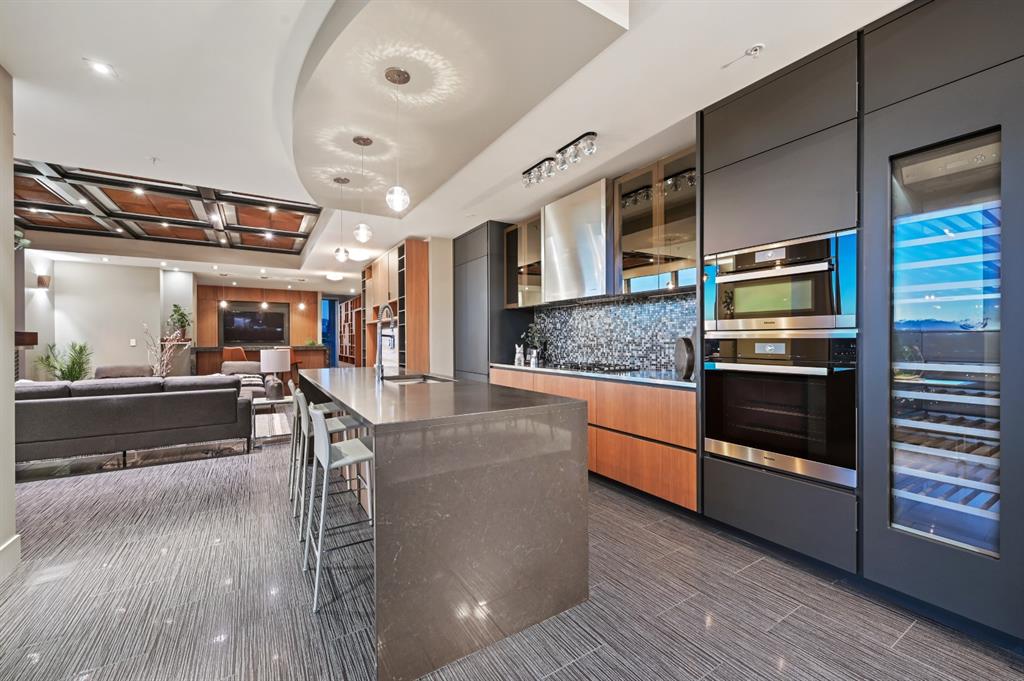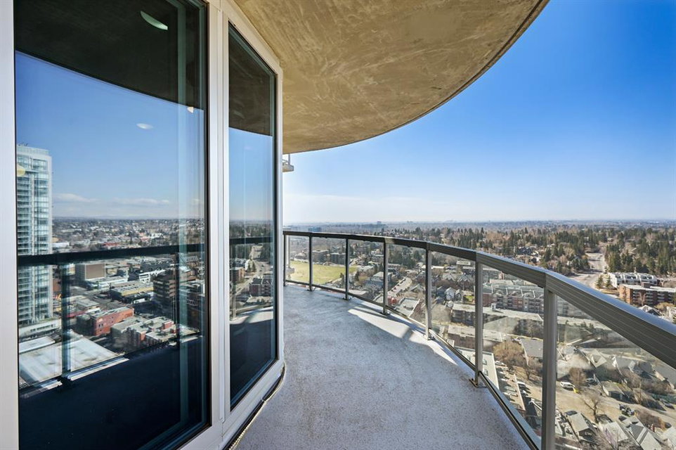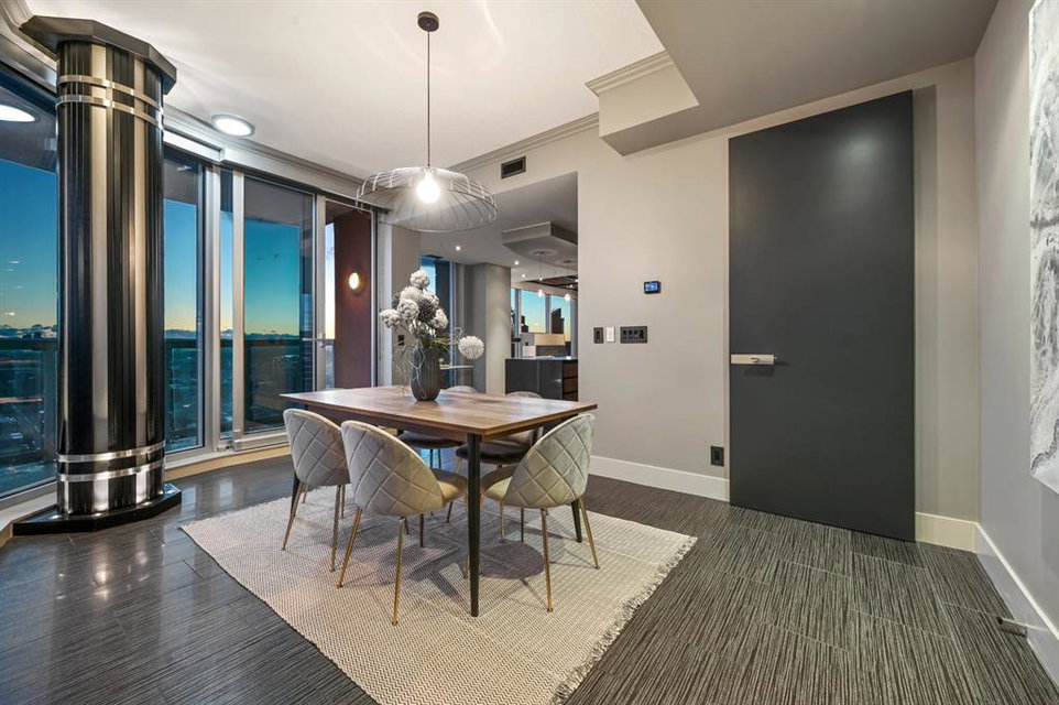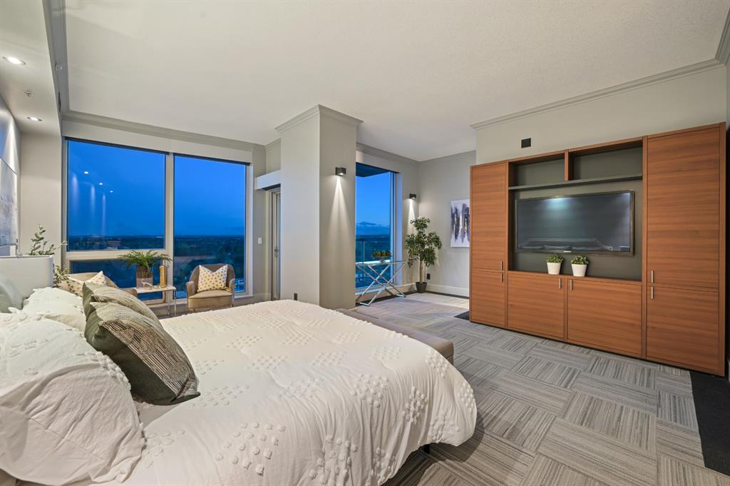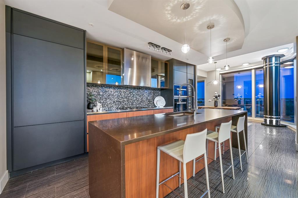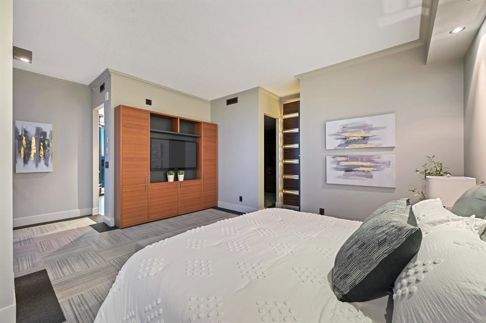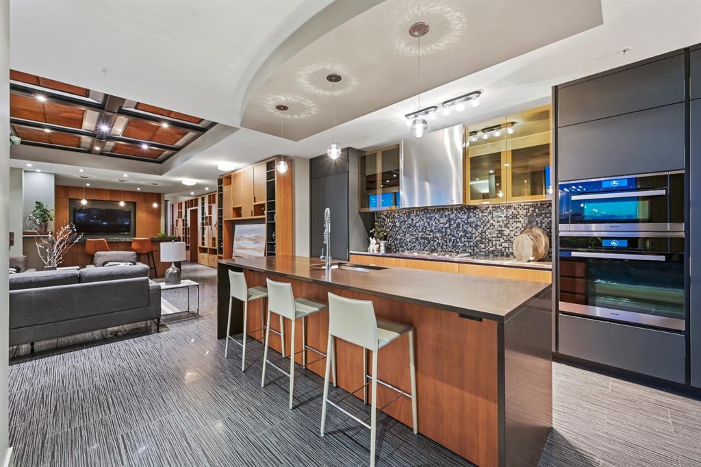 Welcome to The Montana, one of Calgary’s most desirable condominium buildings. This stunning penthouse is the ultimate in luxury living. Featuring FOUR balconies, each with their own breathtaking view, lets you take in both the downtown Calgary and the Rocky Mountain skyline from the comfort and elegance of your home. Located in the Beltline, conveniently off 17th Avenue, and steps to all of the trendy shops, restaurants, amenities, and nightlife you could hope for. This suite is truly one-of-a-kind. Fully renovated to taste with Italian marble flooring throughout the living, dinning, and kitchen areas. Upgraded custom Lualdi doors and custom Poliform cabinetry can be found throughout the suite, plus custom built-ins for all walk-in closets and the kitchen pantry. Floor to ceiling windows throughout the unit are automated with Lutron blinds in all rooms. The living room is the ultimate entertaining space with a custom dry bar, cozy gas fireplace and floor to ceiling windows facing the mountains. The meticulously upgraded kitchen boasts an in-wall oven, microwave, cooktop, dishwasher, and refrigerator/freezer all from Miele, and includes an oversized Gaggenau wine fridge. The expansive island provides plenty of countertop space for cooking and dining. The dining area offers great ambiance, breathtaking views of the mountains, plenty of space for formal or informal dinning, and access to the main balcony. The spacious primary bedroom has custom Poliform entertainment built-ins, paneled lighting, and a spacious custom walk-in closet. The luxurious ensuite is complimented with elegant Cavalli tiled flooring, dual granite vanity, soaker tub, tiled steam shower, and a towel warmer. The walk-in closet includes custom Poliform mirrored built ins. The primary oasis is finished with a peaceful seating area that opens to your stunning balcony. The office area includes access to the third balcony and delivers spectacular city and mountain views complimented by more custom cabinetry. Down the hallway you’ll find the second bedroom, a two-piece bathroom with a floating vanity including motion censored under sink lighting, and a large laundry room. The third bedroom includes an impressive custom entertainment system, wall shelving with custom lighting, a walk-in closet with custom built-ins, and a 4th balcony with dazzling views of the downtown core. The three-piece bathroom across the hall has a large benched tiled steam shower, granite floating vanity with under sink motion senor lighting, and a towel warmer. This property also includes two titled underground parking stalls each equipped with an EV charging unit; along with oversized private locked storage. Don’t miss out on this sophisticated home that has some of the best views Calgary has to offer.